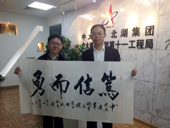 座談會結(jié)束后,傅強(qiáng)年會長有感而發(fā)為十一局題字“篤信而勇”,并附字“中太高度、軍魂塑鑄、鎖定目標(biāo)、標(biāo)楓速度”,以表達(dá)傅老對中太企業(yè)精神的感悟和贊頌。此外,傅強(qiáng)年會長還特別為十一局西藏項(xiàng)目贈詞《臨江仙.金爍布達(dá)拉》。(第十一工程局 供稿) |