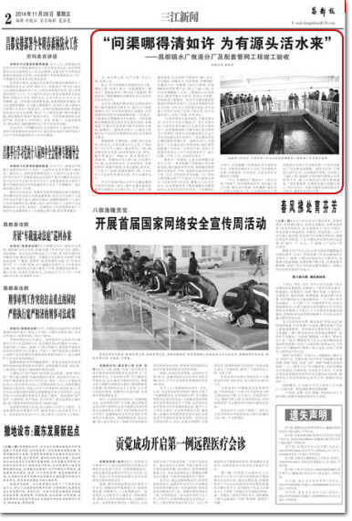 根據(jù)地委、行署的統(tǒng)一部署,項目總投資1.93億元,日供水量3萬立方米,于2013年7月4日正式開工建設,建設凈水廠1座,配套建設取水壩及120米管架橋1座,取水、輸水管道總廠39023米,配水管網(wǎng)總廠22140米。修建綜合辦公樓1座,水處理車間1座,以及變配電間、反沖洗泵房、加氯加藥間、絮凝平流池、V型過濾池、清水池、門衛(wèi)室大門圍墻、附屬設施等工程,于2014年7月20日完成所有建設內(nèi)容,并正式通水運行。