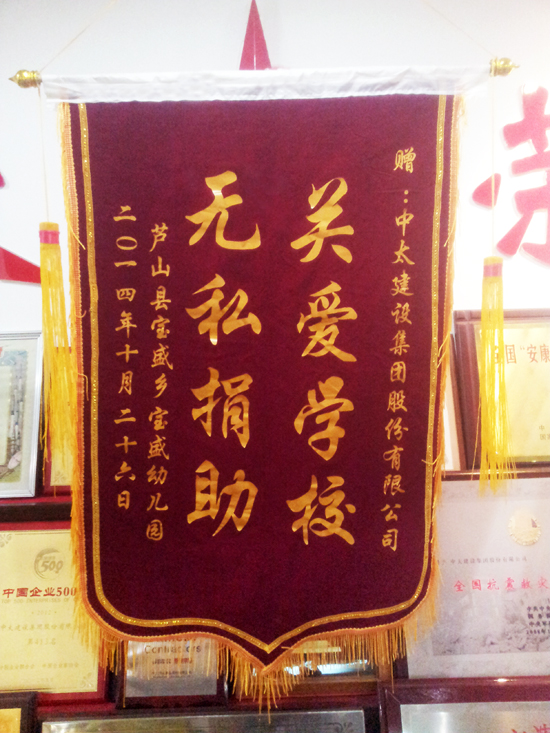 12月12日上午,中太建設(shè)集團(tuán)收到來自四川蘆山縣寶盛鄉(xiāng)幼兒園送來的錦旗,其內(nèi)容為“關(guān)愛學(xué)校無私捐助”,以感謝集團(tuán)公司在幼兒園援建工作中做出的貢獻(xiàn)。