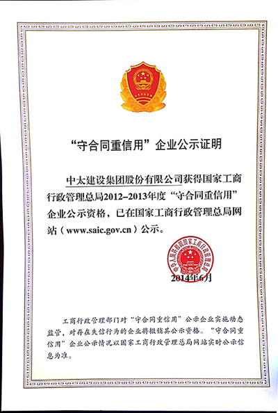 國家工商總局從歷年來各地政府或工商行政管理部門公示的“守合同重信用”企業(yè)中,選出社會(huì)誠信度、美譽(yù)度高的企業(yè)作為2012-2013年度“守合同重信用”企業(yè)向社會(huì)公示,并發(fā)出公告。中太建設(shè)集團(tuán)獲得2012-2013年度“守合同重信用”企業(yè)公示資格。
