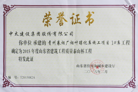“泰山杯”獎是山東省建筑行業(yè)工程質(zhì)量方面的最高榮譽獎,由山東省建設廳、山東省建筑工程管理局、山東省建筑業(yè)聯(lián)合會頒發(fā)。獲獎工程位于山東省青州市玲瓏山北路1818號,項目總投資6700萬元,建筑內(nèi)容為41196平方米煙葉醇化庫主體和部分配套項目,工程自2012年11月20日開工建設,于2013年11月20日竣工驗收完成。