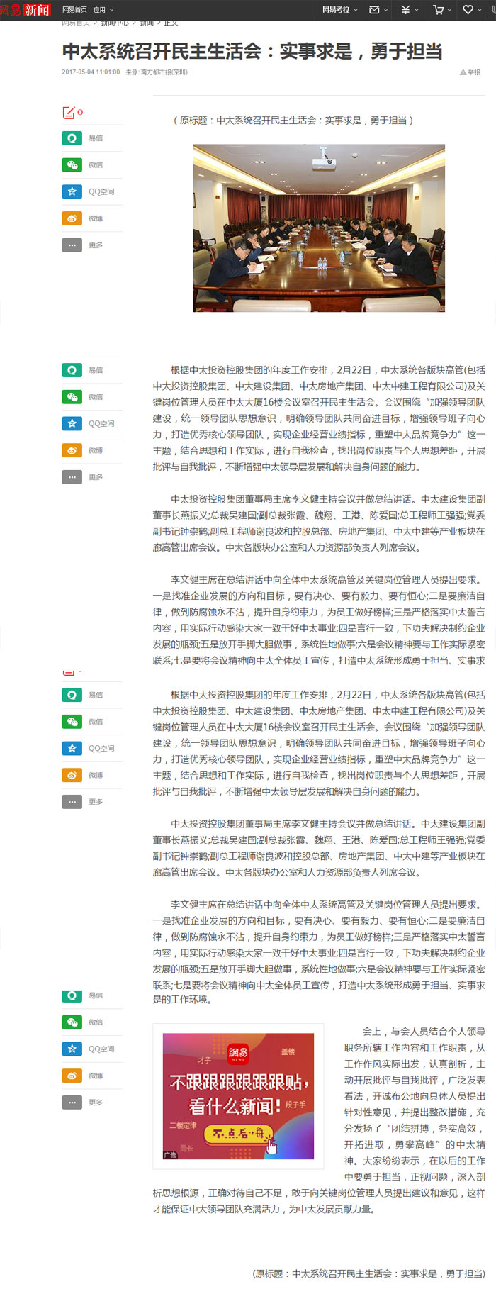 網(wǎng)易新聞報(bào)道了“中太系統(tǒng)召開民主生活會:實(shí)事求是,勇于擔(dān)當(dāng)”