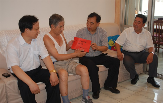 在八一建軍節(jié)到臨之際,7月27日上午,廊坊市人大副主任、市總工會主席王瑞峰(右二)、廊坊市總工會黨組書記、常務(wù)副主席關(guān)景發(fā)(右一),市總工會副主席王泰山在廊坊市建設(shè)局黨委委員、系統(tǒng)工會主任王克峰等領(lǐng)導(dǎo)同志的陪同下,來到集團公司第一生活區(qū)家屬院,看望慰問公司因病家庭困難的軍轉(zhuǎn)干部劉國清(左二),代表市總工會向劉國清表示節(jié)日慰問,并頒發(fā)了慰問金。中太建設(shè)集團黨委書記、董事局主席李文。ㄗ笠唬┡阃繂枴 |