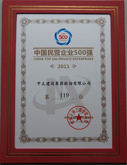 8月25日上午,全國工商聯(lián)在北京召開2011中國民營企業(yè)500強發(fā)布會,發(fā)布2011中國民營企業(yè)500強、2011中國民營企業(yè)制造業(yè)500強名單以及2011中國民營企業(yè)500強分析報告。中太建設(shè)集團以1,527,046萬元的營業(yè)收入業(yè)績,排名2011中國民營企業(yè)500強第119位。在河北省民營企業(yè)建筑業(yè)中位列第一。