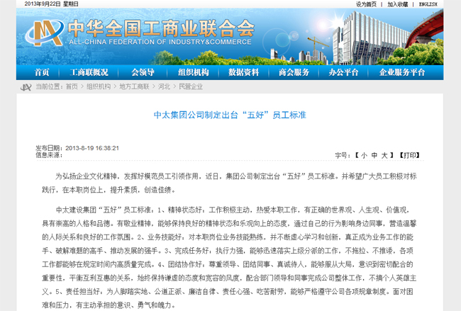 全國工商聯(lián)網(wǎng)站8月19日報道了中太建設(shè)集團制定出臺“五好”員工標準
