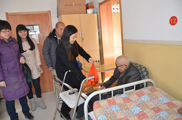 11月29日上午,在集團(tuán)工會(huì)副主席張娟娟的帶領(lǐng)下,中太建設(shè)集團(tuán)的12名團(tuán)員青年代表,驅(qū)車來(lái)到中太康復(fù)醫(yī)院慰問(wèn)老人、送去愛心,并給老人帶去新鮮的水果。到達(dá)醫(yī)院后,他們?cè)诳祻?fù)醫(yī)院醫(yī)護(hù)人員的陪同下,進(jìn)入病房與老人談心聊天,了解老人的吃住情況,并像醫(yī)護(hù)人員了解老人的住院治療情況,宛如一家人一般,一時(shí)間房間里充滿了濃濃親情。