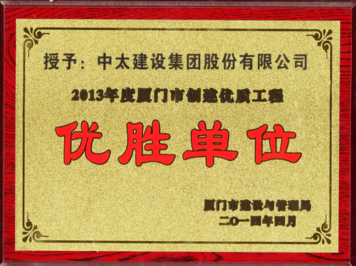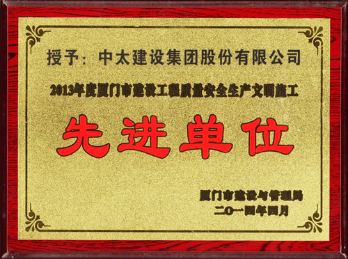 近日,中太建設集團榮獲2013年度“廈門市創(chuàng)建安全文明工地優(yōu)勝單位”、“廈門市建設工程質量安全生產文明施工先進單位”、“廈門市創(chuàng)建優(yōu)質工程優(yōu)勝單位。何波、曹仰高被評為先進個人。(第九工程局)