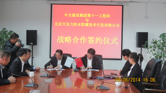 9月6日,中太建設(shè)集團(tuán)第十一工程局與國內(nèi)防水工程行業(yè)知名企業(yè)——北京萬寶力防水防腐技術(shù)開發(fā)有限公司簽署合作協(xié)議,確立了防水工程服務(wù)戰(zhàn)略合作伙伴關(guān)系。十一局局長馬功云、副局長陳可偉、吳夕強(qiáng)以及萬寶力公司董事長王力共同出席了此次簽約儀式。