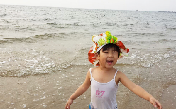 拍了照片后,突然讓我感覺像文清同學(xué)媽媽去澳門時(shí)住在海景房拍的海景照片! 看完海景就開始了匆忙的換泳衣準(zhǔn)備下海,海景公寓的好處就是出來小區(qū)走上自己的棧道就是小區(qū)的私家海灘,非常干凈。近距離的接觸大海,吹著涼爽的風(fēng)(天氣多云,溫度在29度),讓我們一行幾個(gè)馬上開懷起來,每個(gè)人的興奮在臉上流露。孩子是最興奮的,跑到海邊上,任憑海浪一層層的打過來(這天風(fēng)并不大),孩子說:“媽媽,你看大海碰我了!”竟然用起了擬人句,把大海打過來的浪花比作在“碰”,這字用的多么美妙。∥乙贿呅蕾p著美景一遍在咂摸著這話,贊嘆著孩子的天真和用詞之妙。我們真的跳入大海浸泡的時(shí)候,舅舅在照顧著她,突然一個(gè)浪打在了孩子的頭上,孩子嚷著:“我要離開大海了”,這是在身邊的舅舅轉(zhuǎn)告我的,我在想孩子真是長(zhǎng)大了,會(huì)表達(dá)很多個(gè)人的感情了,“啊,我要離開大海了”是一個(gè)陳述句,但是好像是表達(dá)著一種不舍得離開但是有不得已的感情,她很想在大海里再待一會(huì),但是因?yàn)樗焕嘶ù驖窳祟^發(fā),依她個(gè)人的膽量可能害怕了,所以說了句“啊,我要離開大海了”,孩子的成長(zhǎng)讓我們自覺不自覺真切感受到了。然后她自己在海灘玩沙子,挖了大大的沙坑,每當(dāng)海浪沖過來的時(shí)候,總是興奮的說:“媽媽大海幫我大忙了,還給其他家人也興奮的嚷嚷,大?墒菐土舜竺α恕薄.(dāng)我問她到底幫了什么忙時(shí),她說:“大海給我的沙坑送來了水啊”(估計(jì)是她不用拿著自己的小碗去海邊舀水了)。我感嘆著女兒的天真浪漫和快樂興奮,內(nèi)心在想:帶著孩子出來玩玩是多么對(duì)的選擇,大自然的風(fēng)光的確是能刺激人的靈感,說了那么多令我平時(shí)聽不到的妙字妙語(yǔ)。這趟短途旅行意義非凡!